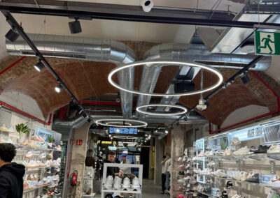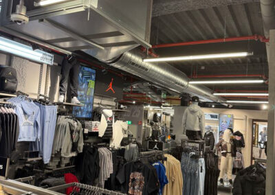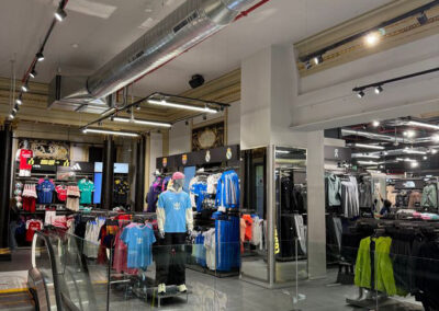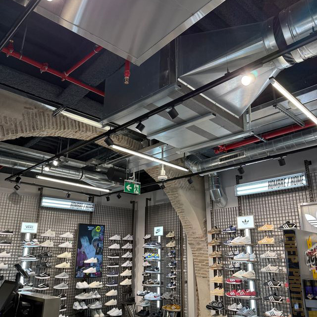 Para este proyecto se ha diseñado una instalación integral de climatización mediante un sistema VRF Midea de 3 tubos de última generación, concebido para garantizar el máximo confort y la mayor eficiencia energética. La tienda, los vestuarios, los almacenes y todas las zonas interiores disponen de climatización completa, con la mayor parte de las instalaciones de impulsión y retorno vistas, respetando y realzando la arquitectura del edificio.
